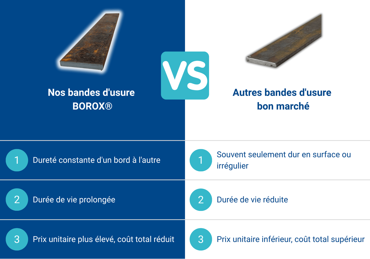 At first glance, BOROX® parts may seem more expensive. However, their longer service life and lower maintenance requirements mean significantly lower overall costs. Cheaper wear strips, on the other hand, result in higher overall costs despite a lower unit price – due to more labor during replacement and shorter operating time.